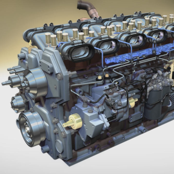 This model of a six-cylinder diesel engine is designed to be partially representative and partially diagrammatic. Certain elements, like electrical and oil pathways, are highly simplified, while at the same time representational elements (bolt holes, for example) have been retained to provide a satisfyingly complex, but not visually overwhelming, appearance. The model is shaded with stylized chrome and metal shaders, and has a fine cel shading outline, hearkening to airbrushed automotive illustration.