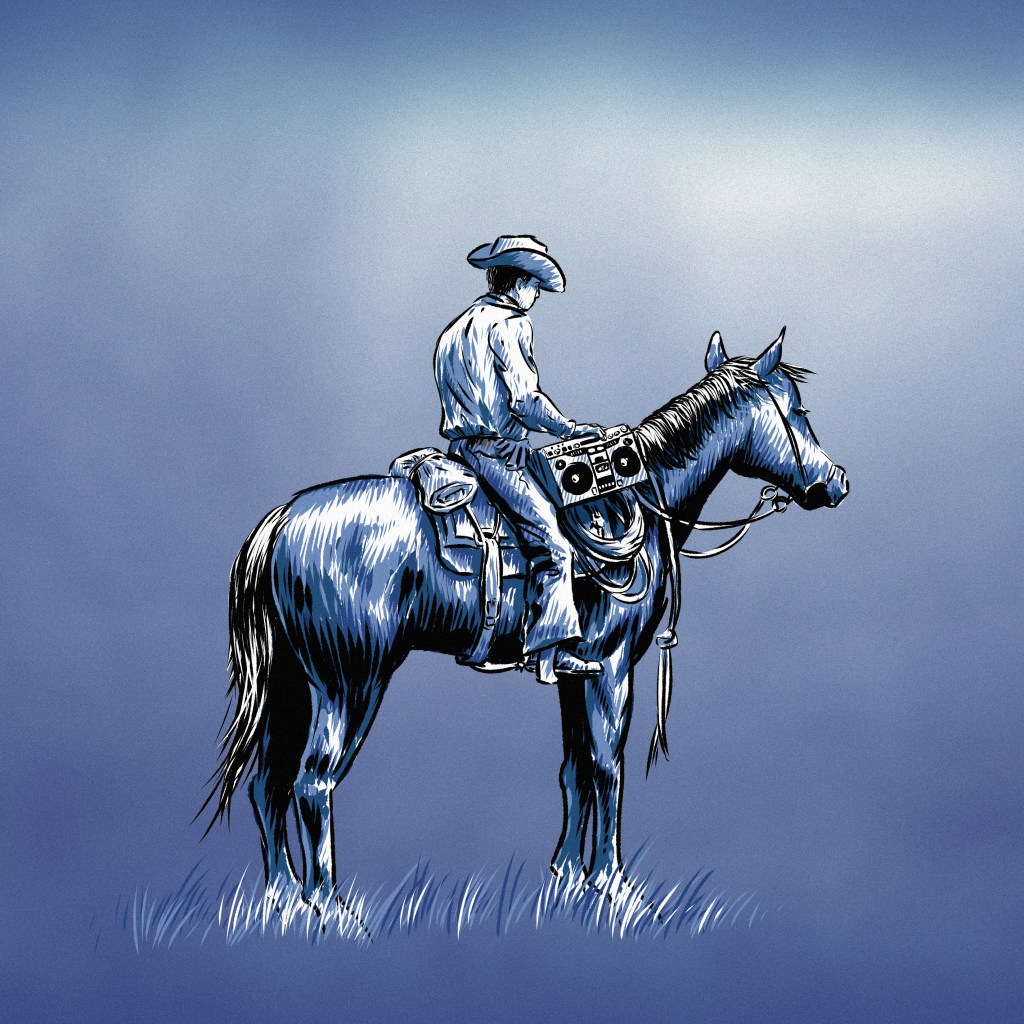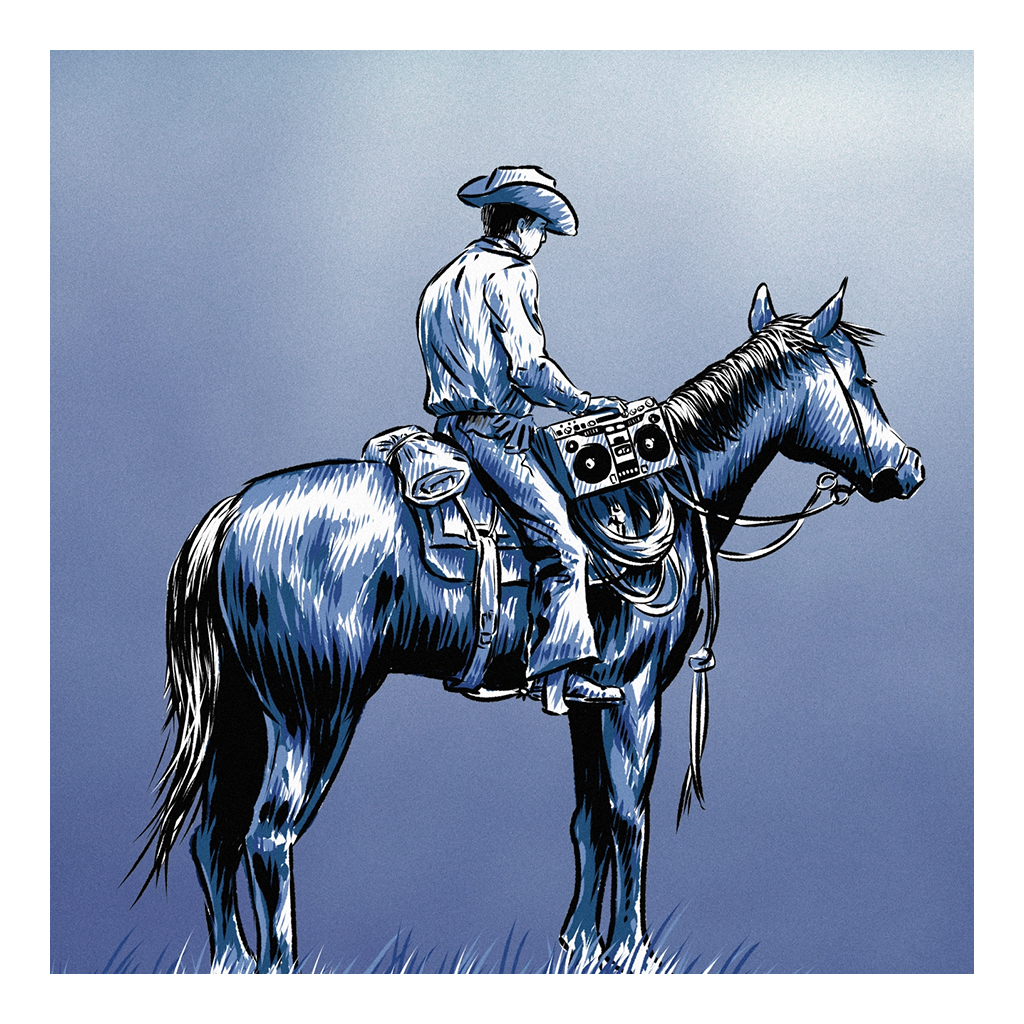 This illustration is for a small collection of cowboy poetry recitations set to mellow acoustic hip-hop beats. The drawing is shaded monochromatically so that each mp3 track can have a different color scheme applied to its artwork. The shading is reminiscent of linoleum cut prints.