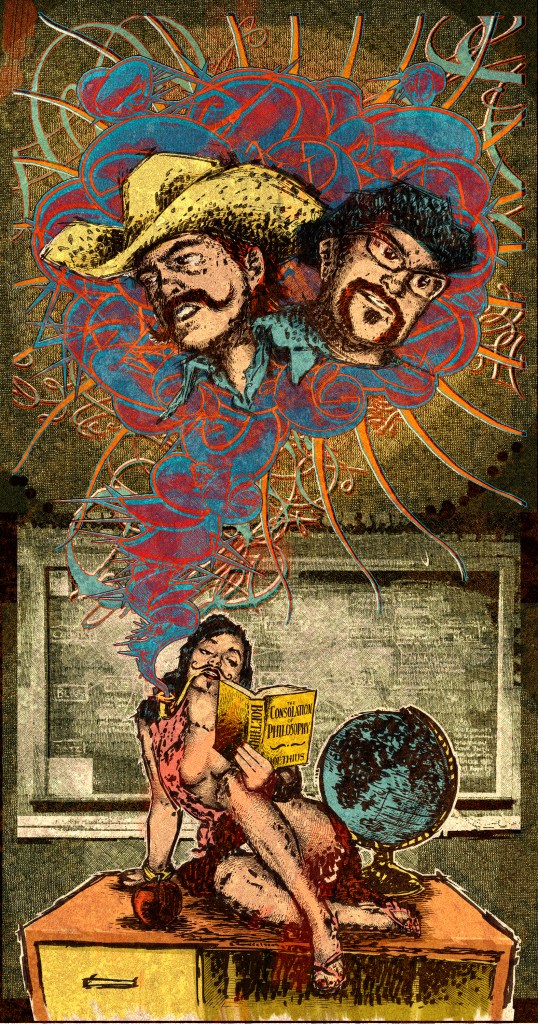 This illustration is for a vertically-oriented CD insert. The image is inspired by John Kennedy Toole’s novel A Confederacy of Dunces, in which the protagonist finds a printed pin-up image of a model reading Boethius, his favorite philosopher. This image combines hand-drawn portraits of the pin-up model smoking a pipe, below, and above are the band members, whose faces are within the cloud of smoke. The smoke cloud is composed of hand-drawn shapes mapped to 3D elements that have been instanced and set to inherit the transformations of their parent. The result of this hierarchy is a fractal-esque structure that can be translated and rotated in interesting spirals and twists.